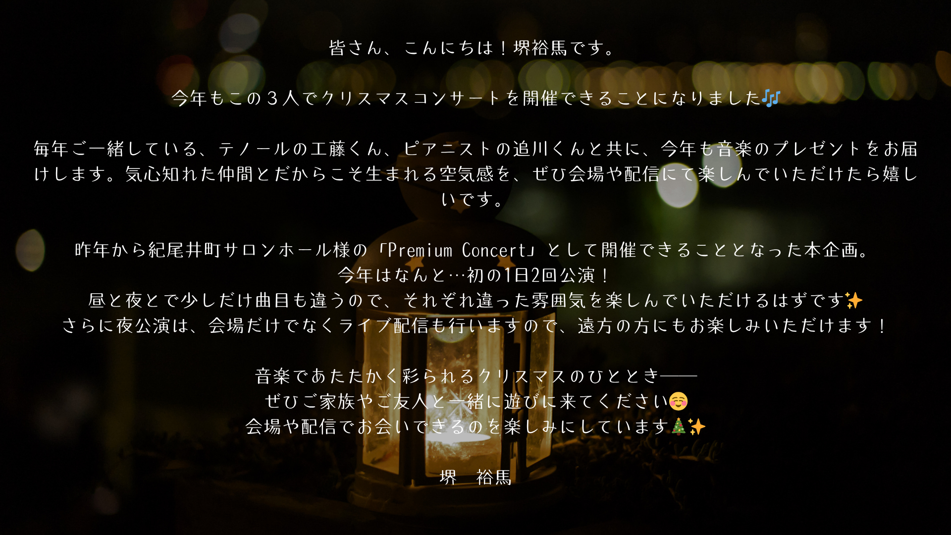 毎年ご一緒している、テノールの工藤くん、ピアニストの追川くんと共に、今年も音楽のプレゼントをお届けします。気心知れた仲間とだからこそ生まれる空気感を、ぜひ会場や配信にて楽しんでいただけたら嬉しいです。